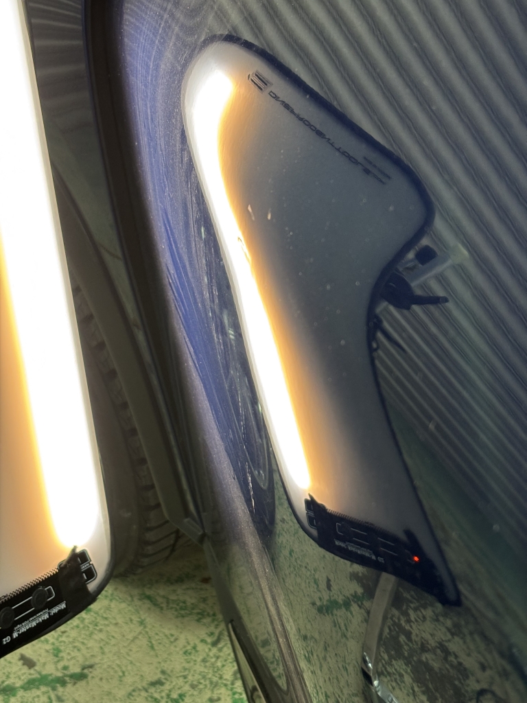こちらはアルミパネルになっており、ガッツリ傷もついてるので、板金塗装となるのですが、なるべくパテを少なくしたいのでデントリペアである程度ですがリペアしていきます。