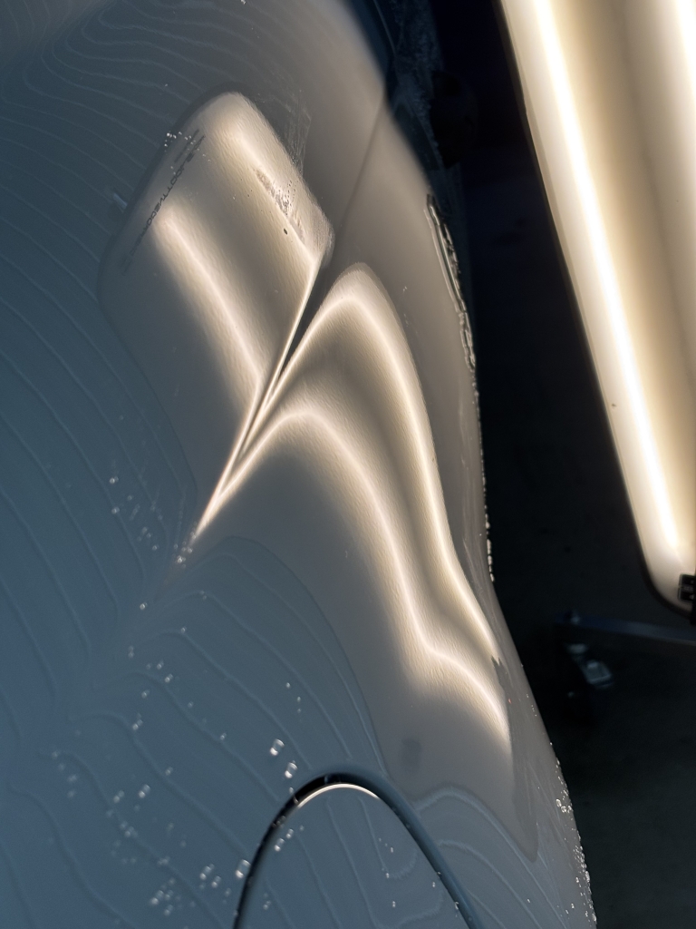 リアクォーターに出来た3cmちょいのへこみです。内張りは先方で外していただけたのですが中々体勢とアクセスが辛く時間かかりました。